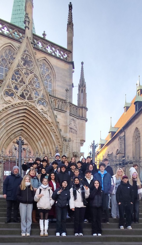 Am Dienstag, dem 16.12.2025, genau zu der Zeit, in der der Adventskalender langsam leerer wird und Weihnachtslieder selbst im Kopf Dauerschleife laufen, machten sich die Klassen 9a und 9b auf den Weg zu einem vorweihnachtlichen Abenteuer: Schulausflug nach Erfurt. Begleitet wurden wir von Frau Kriwan, Herrn Schipper und Frau Schierz, die sich an diesem Tag weniger als Lehrkräfte und mehr als eine Mischung aus Reiseleitung, Aufsicht und weihnachtlicher Nervenstärke bewährten.