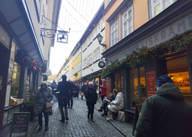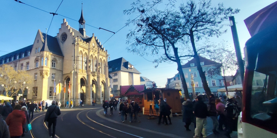 Mit dem Zug ging es Richtung Thüringer Landeshauptstadt. Dick eingepackt, mit Rucksäcken, Snacks und der leisen Hoffnung, dass niemand seine Fahrkarte verliert, rollten wir los. Am Erfurter Hauptbahnhof angekommen – erstaunlicherweise vollständig und relativ pünktlich – stiegen wir in die S-Bahn zum Fischermarkt um. Unser Rentierschlitten auf Schienen brachte uns mitten hinein ins vorweihnachtliche Erfurt.