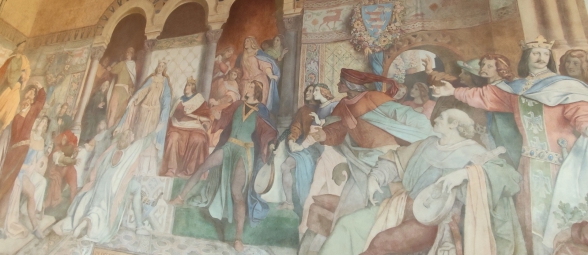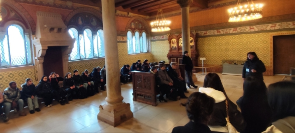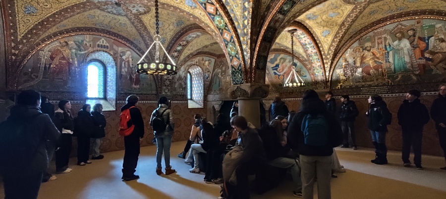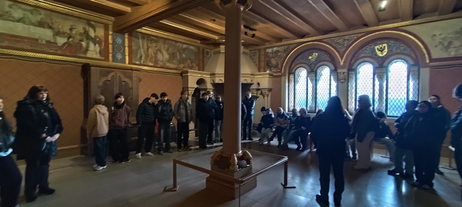 Im Anschluss nahmen wir an einer museumspädagogischen Führung teil, die speziell auf die Altersstufe unserer Achtklässler zugeschnitten war. Gemeinsam betraten wir den imposanten Palas mit seinen romanischen Bauteilen und kunstvoll gestalteten Innenräumen. Besonders beeindruckend war der Festsaal, in dem wir vom sagenumwobenen Sängerkrieg erfuhren – einer Legende, die die Wartburg als Ort höfischer Kultur und Dichtung berühmt machte. Hier begegneten die Schülerinnen und Schüler historischen und literarischen Gestalten wie Walther von der Vogelweide.